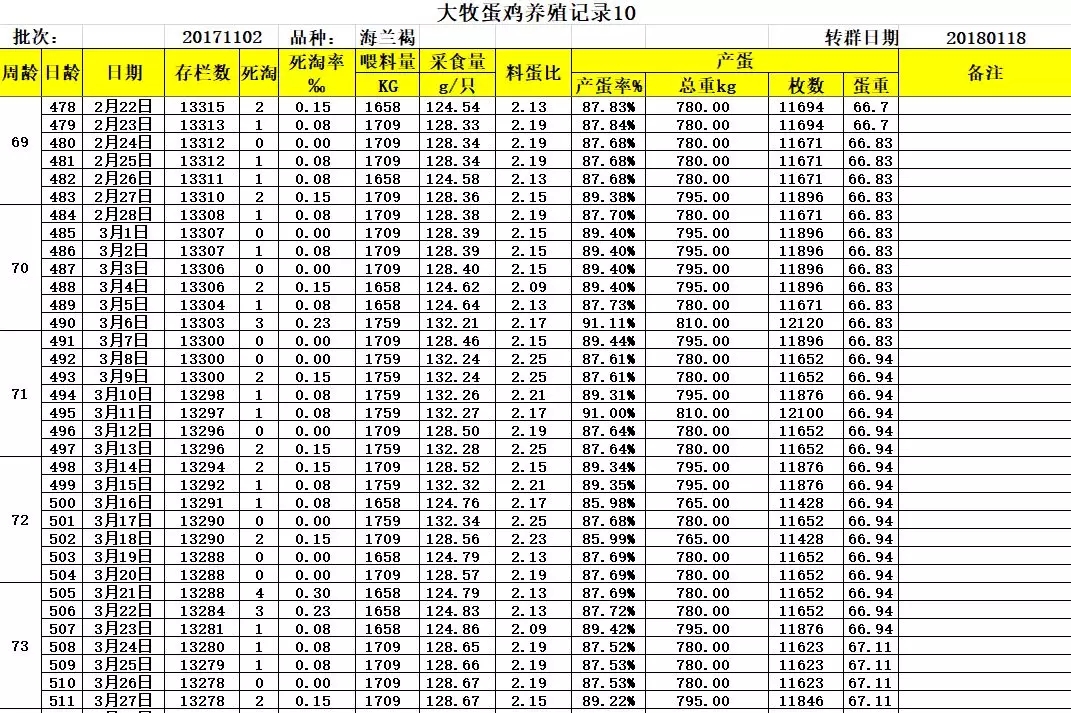 從2017年11月2日開始,大牧養殖有限公司引進華裕海蘭褐雛雞41800羽,轉群后分為3棟,(本文統計數據截止到2019年6月5日雞群83周齡末,581日齡。)以下為其中一棟生產數據,下面就把大牧禽業的生產數據給大家做個分享: