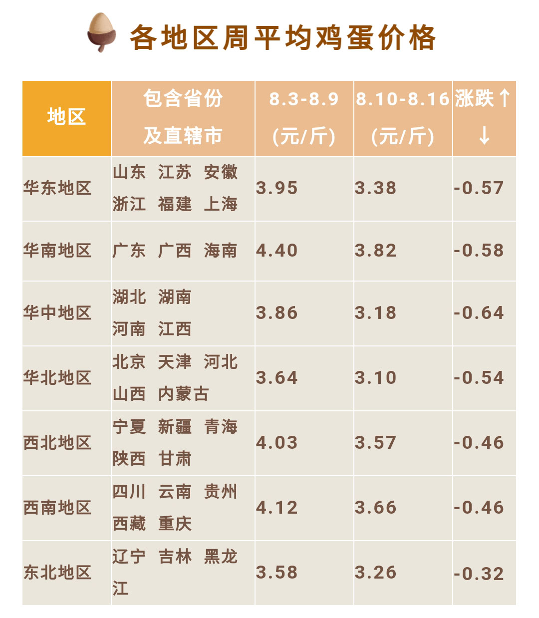 雞蛋價格 | 截止8月16日各地區周平均雞蛋價格及行情分析